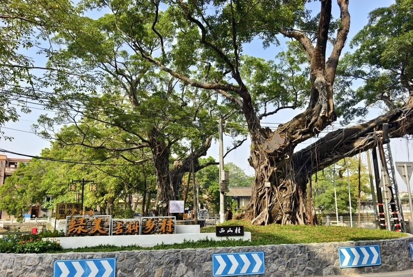 近日,记者来到广州市番禺区化龙镇西山村,首先映入眼帘的便是村头古树交通岛,两株古榕参天而立,树冠如盖,枝叶繁茂,成为村庄最醒目的地标门户。
