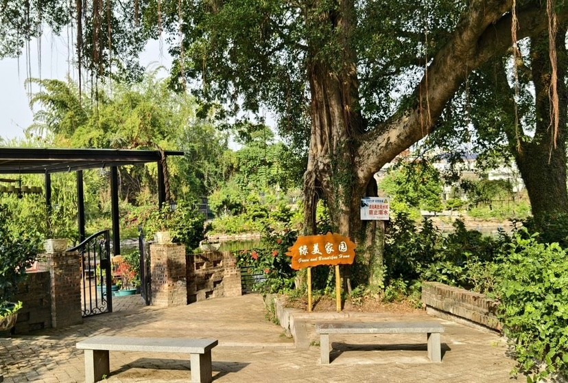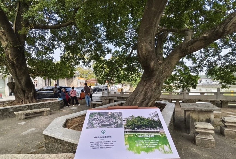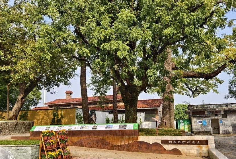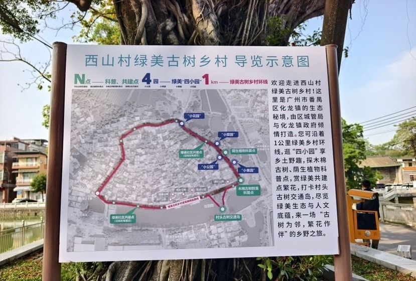 沿着1公里绿美古树乡村环线步行,古树的苍劲、古祠堂的肃穆、池塘的静谧与民居的烟火气交融共生,村民们悠然地在树下聊天、对弈,其乐融融;在木棉古树群落科普点,图文并茂的标识牌详细介绍了古树知识,寓教于景;在古树广场,五株古树与利用周边闲置地巧妙改造而成的“绿美四小园”(小公园、小菜园、小花园、小果园)和谐共生;在绿美社区共建点,则是繁花似锦,与一旁的科普标识相映成趣,为古朴村庄增添了鲜艳活力。