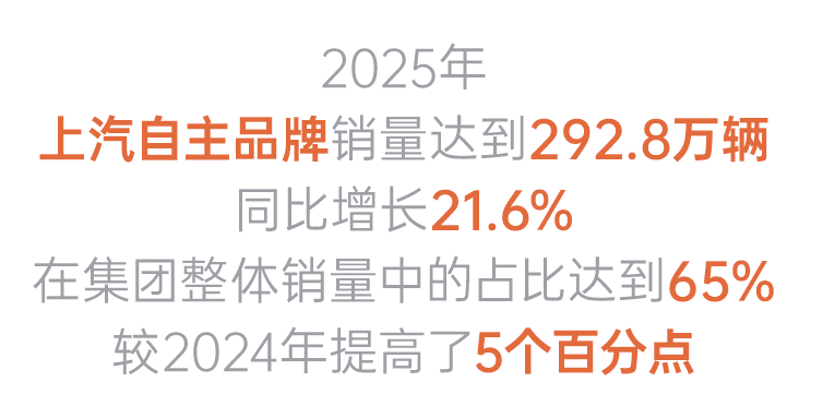 通过自主品牌乘用车、商用车业务实施一体化管理,上汽积极构建更灵活高效的运营体制机制,打通产品定义、研发、生产和营销全链路,更贴近用户需求、更敏捷响应市场。2025年,上汽自主品牌(荣威、MG、智己、大通、五菱、宝骏等)销量达到292.8万辆,同比增长21.6%,在集团整体销量中的占比达到65%,较2024年提高了5个百分点,在竞逐智电新赛道的关键阶段,自主品牌成为上汽创新发展的“主力军”和“急先锋”。