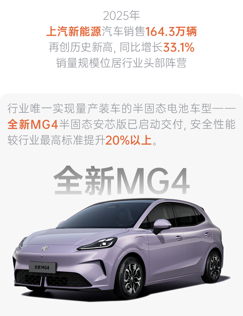 上汽以用户为中心,加速推动固态电池、数字底盘、DMH超级混动、恒星超级增程、“端到端”智驾大模型等一系列行业领先智电技术量产上车,积极打造更安全、更舒适、更便捷的出行体验。2025年,上汽新能源汽车销售164.3万辆,再创历史新高,同比增长33.1%,销量规模位居行业头部阵营。
