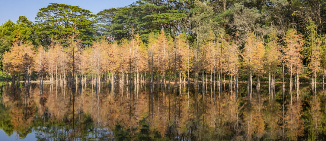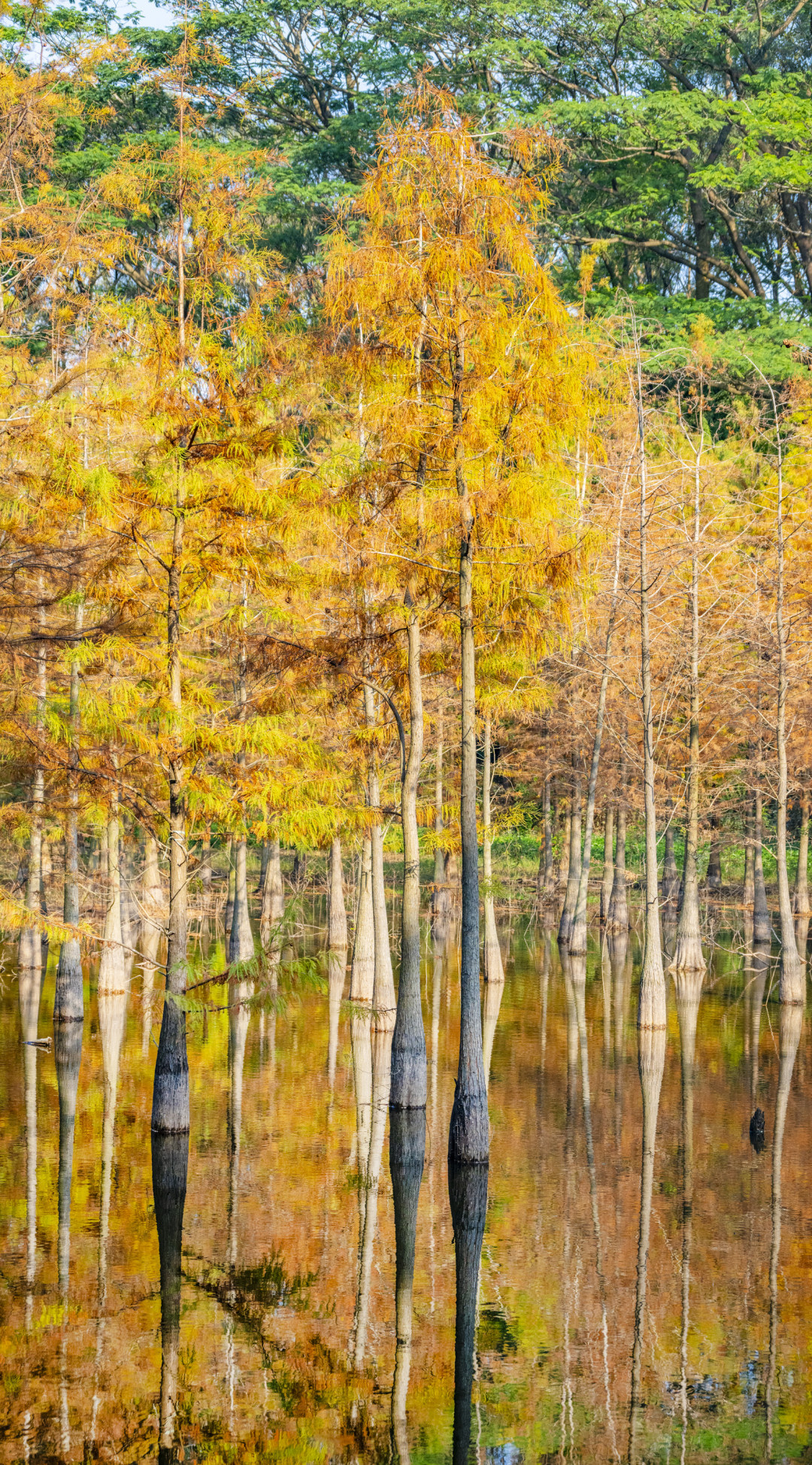 岸边落羽杉倒映在澄澈湖水中,宛如水下燃烧的簇簇火焰。