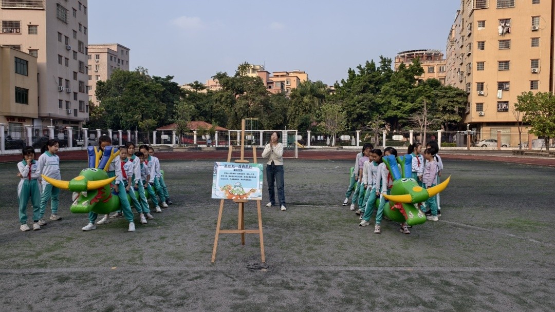 在趣味挑战的“醒狮巡游·垃圾归位”项目中,学生两人一组,模拟醒狮,默契配合,将代表垃圾的沙包投入分类垃圾桶,在接力竞赛中强化了环保意识与团队精神。在“齐心力·龙舟前行”项目中,学生六人一组,共骑旱地龙舟,喊着口号迈着整齐的步伐协同前进,现场“一二一”的呐喊声此起彼伏。学生们从中体会到,家园环境的改善如龙舟前行,需要所有人同心协力、步调一致。