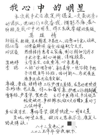 在感谢信中,杨爷爷细致回顾了治疗过程中的温暖细节。在他特别手书的“英雄榜”上,写下了从主诊医生、护理团队到麻醉、康复等各个岗位工作人员的名字,并附上了个人化的感谢寄语。