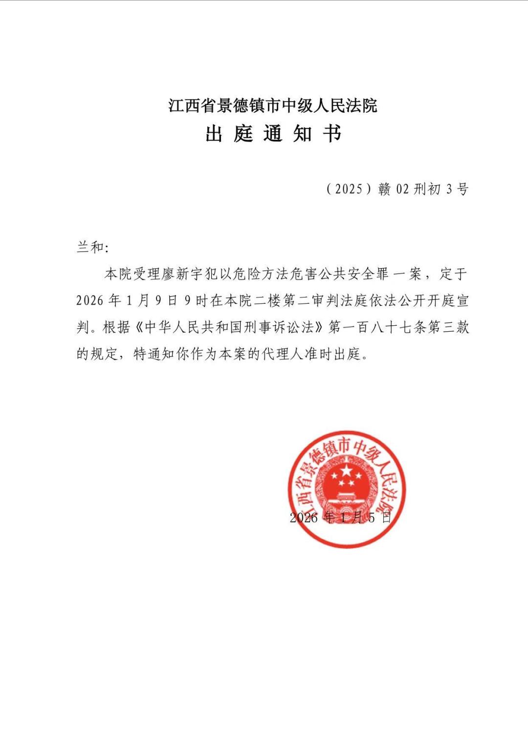 此案曾在2025年4月15日在景德镇市中级人民法院开庭审理,肇事者廖某某将以以危险方法危害公共安全罪被起诉。而后处于择期宣判阶段,经批准案件曾三次延期审理。