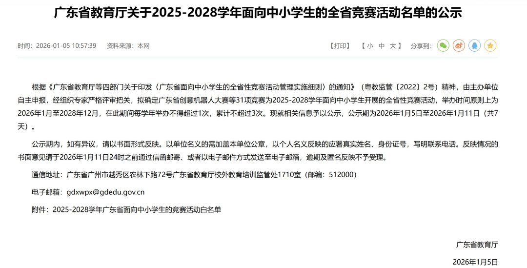 1月5日,广东省教育厅官网发布公示称,拟确定广东省创意机器人大赛等31项竞赛为2025-2028学年面向中小学生开展的全省性竞赛活动,举办时间原则上为2026年1月至2028年12月,在此期间每学年举办不得超过1次,累计不超过3次。