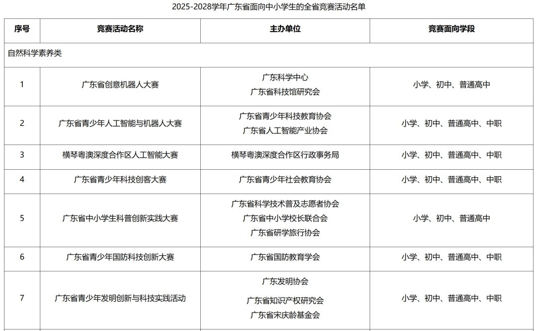 公示还提到,以下单位已获得2025—2028学年面向中小学生的全国性竞赛活动广东省办赛授权。包括: