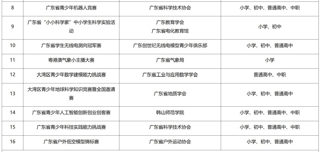 13. 广东省科学技术协会:广东省青少年科技创新大赛,竞赛面向初中、普通高中、中职。