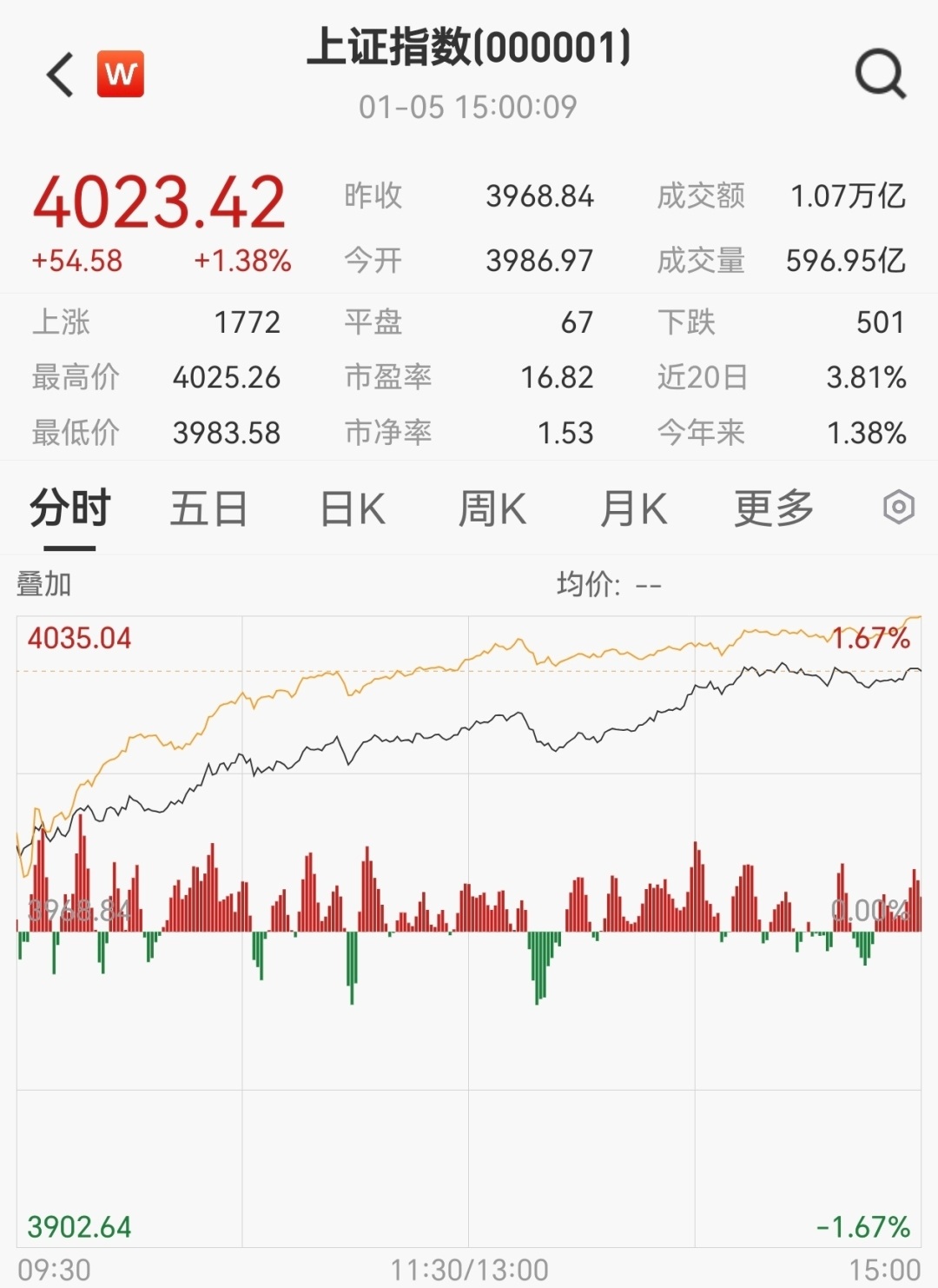 A股2026年“开门红”!1月5日,上证指数放量涨逾1%,重返4000点。全市场近4200股上涨,全日成交额2.57万亿元,较去年最后一个交易日增5015亿元。截至收盘,上证指数收涨1.38%,报4023.42点,深证成指涨2.24%,创业板指涨2.85%。