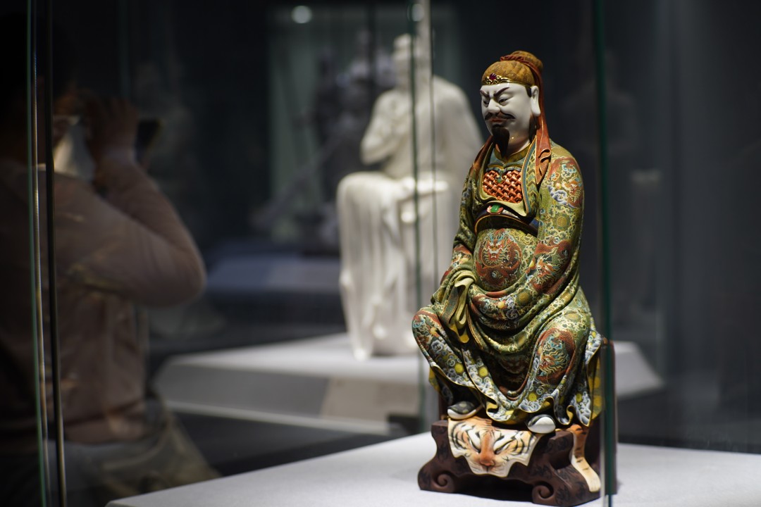 此次展品中,曾在国家博物馆引起轰动的德化白瓷“玉漱公主”千里迢迢来到广州。这件名为《神话》的作品由艺术家连德理创作完成,将东方女性的温婉典雅与神话意境相融,人物纱衣处薄至0.2毫米,与根根分明的发丝交相辉映,工艺之精令人叹为观止。
