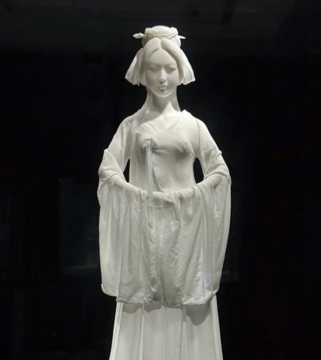 在制作这件作品长达半年的探索中,连德理至少经历了上百次失败,最终运用自主研发的“高韧薄胎瓷衣技艺”,成功将瓷衣厚度控制在0.2毫米,让坚硬陶瓷化作绕指柔纱,远观似云霭流风,近触方知瓷骨铮铮;光影在蝉翼般的衣袂间游走,千年工艺与银幕美学在此刻共舞生辉。
