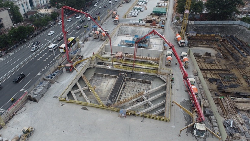 作为超深车站,京溪路站的混凝土用量巨大,车站单次最大混凝土浇筑量达2525立方米。为确保施工质量和效率,项目团队组建技术攻坚专班,采用“分段分层浇筑+喷淋温控养护”工艺,将大体积混凝土构件划分为多个浇筑段,每个浇筑段采用分层推移式浇筑,将每层浇筑厚度控制在设计标准内。