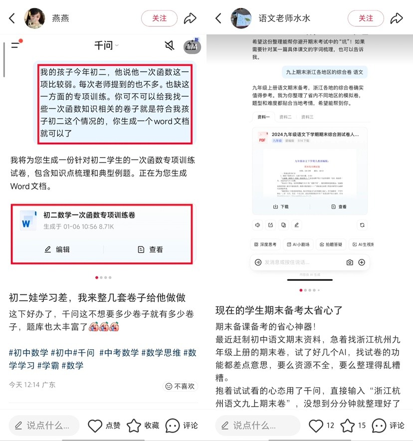 这极大地缓解了家长的搜题压力。一些家长惊呼“太牛了!”,不少家长在社交媒体分享用千问找卷子的体验:“以前找卷子要翻遍十几个群或者充值各种APP,现在直接问千问,确实省心。”