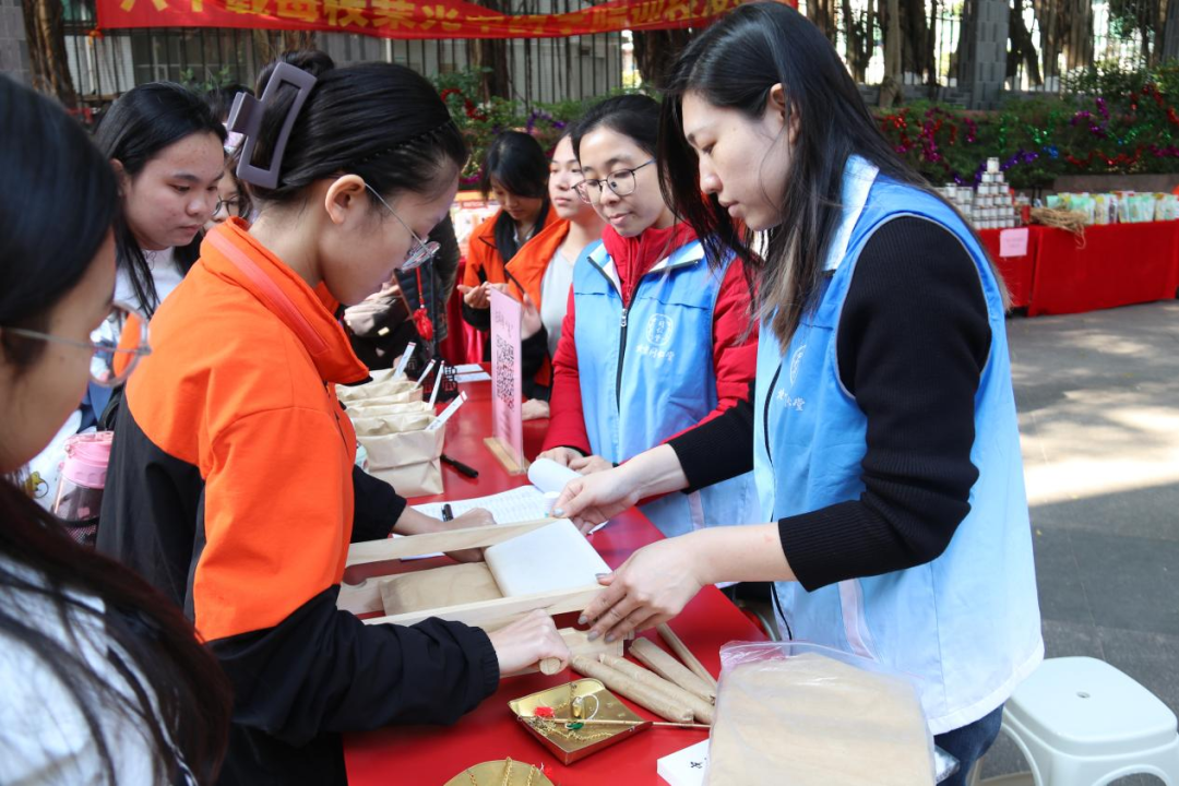 互动体验区气氛十分活跃。现场,师生校友在工作人员的指导下亲手制作艾条与香囊,从选材、称量到成型,体验传统制药技艺的严谨与匠心。不少同学表示,这样的动手体验让书本上的中药知识变得真切可感,也让他们对中医药文化有了更生动的理解。