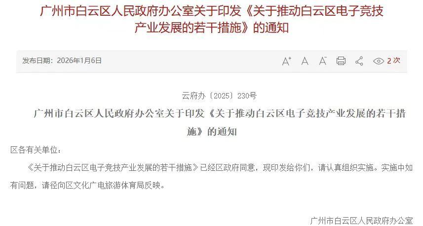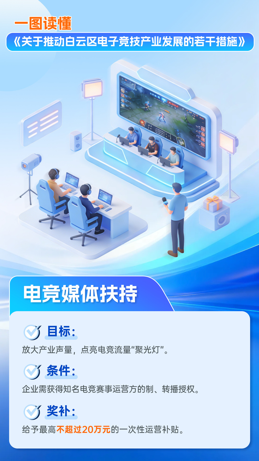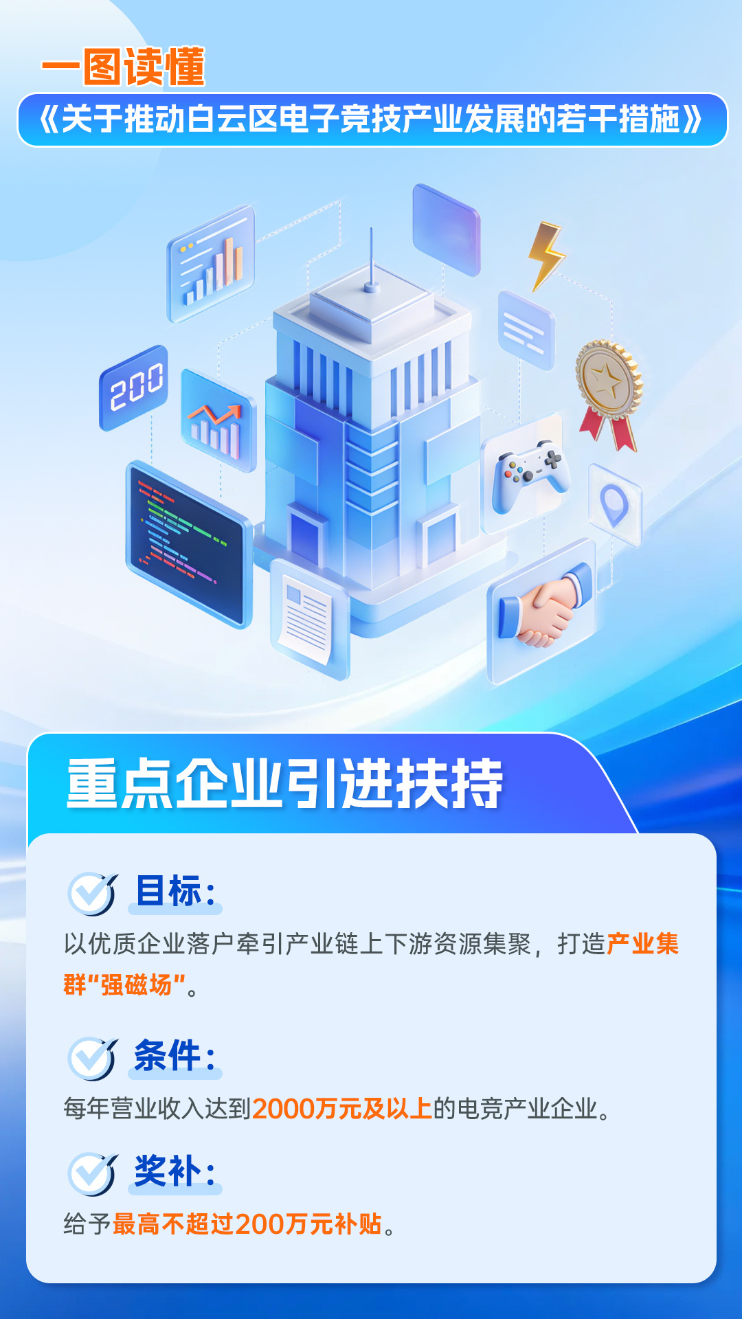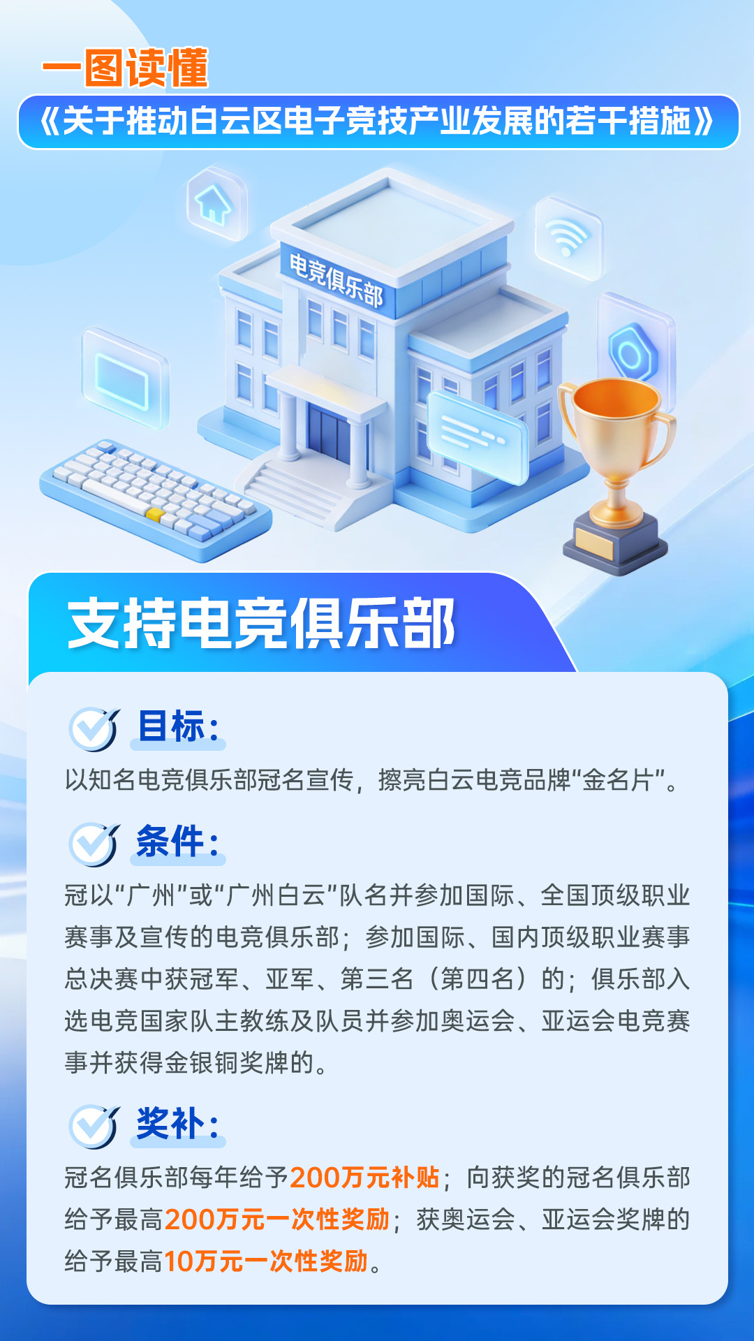 1月6日,广州市白云区正式出台《关于推动白云区电子竞技产业发展的若干措施》(以下简称《措施》),推出11条措施支持电竞产业发展。符合条件的电子竞技产业企业、电竞俱乐部落户白云区最高可获200万元补贴,单项奖励最高可达500万元。