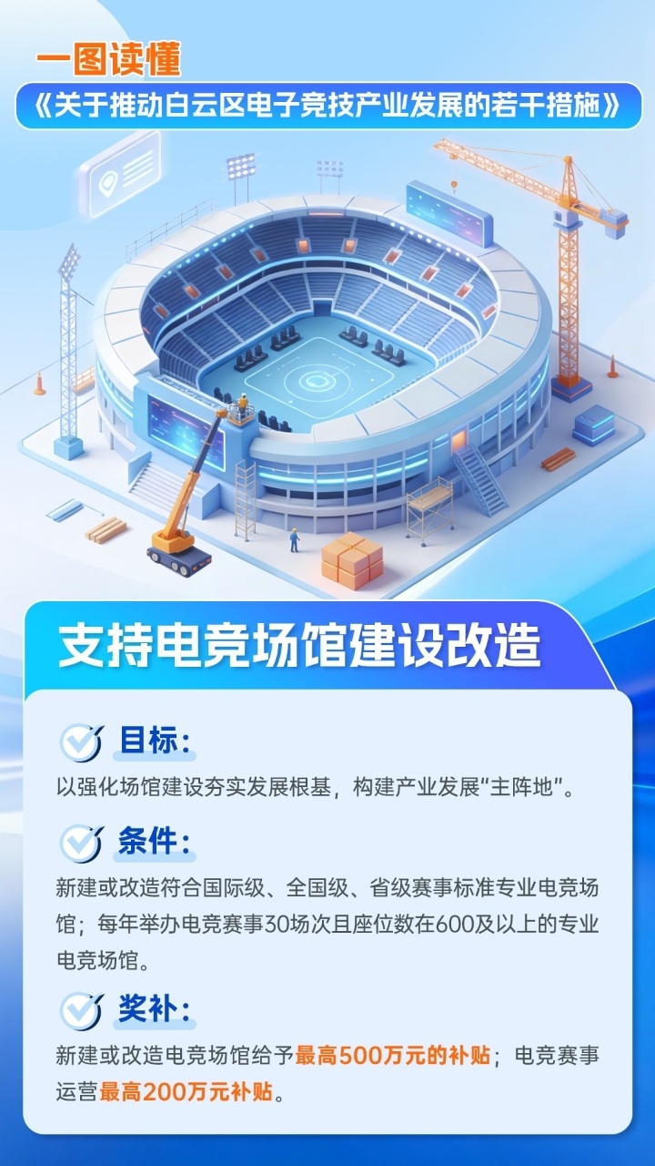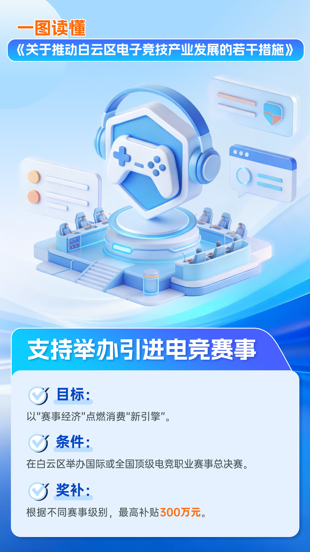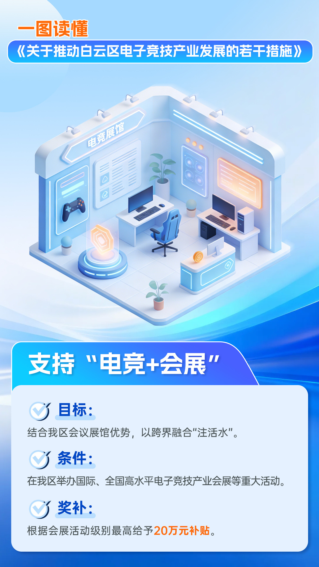 依托广州白云国际会议中心、广州空港博览中心等会展资源,对在区内举办的国际、全国高水平电子竞技产业会展等重大活动,单项活动每年给予不超过20万元补贴,推动电竞与会展产业深度融合,拓展产业价值边界。