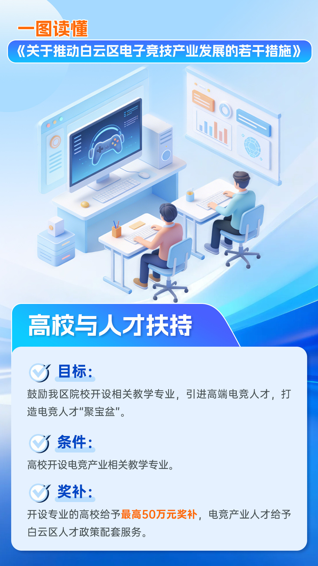 支持区内高校、职校开设电竞相关专业,给予最高不超过50万元一次性补贴;对引进的国际国内赛事冠军选手、知名俱乐部管理人员等高端人才,按区人才政策提供配套服务,为我区电竞产业储备赛事运营、解说、技术支持等核心人才。