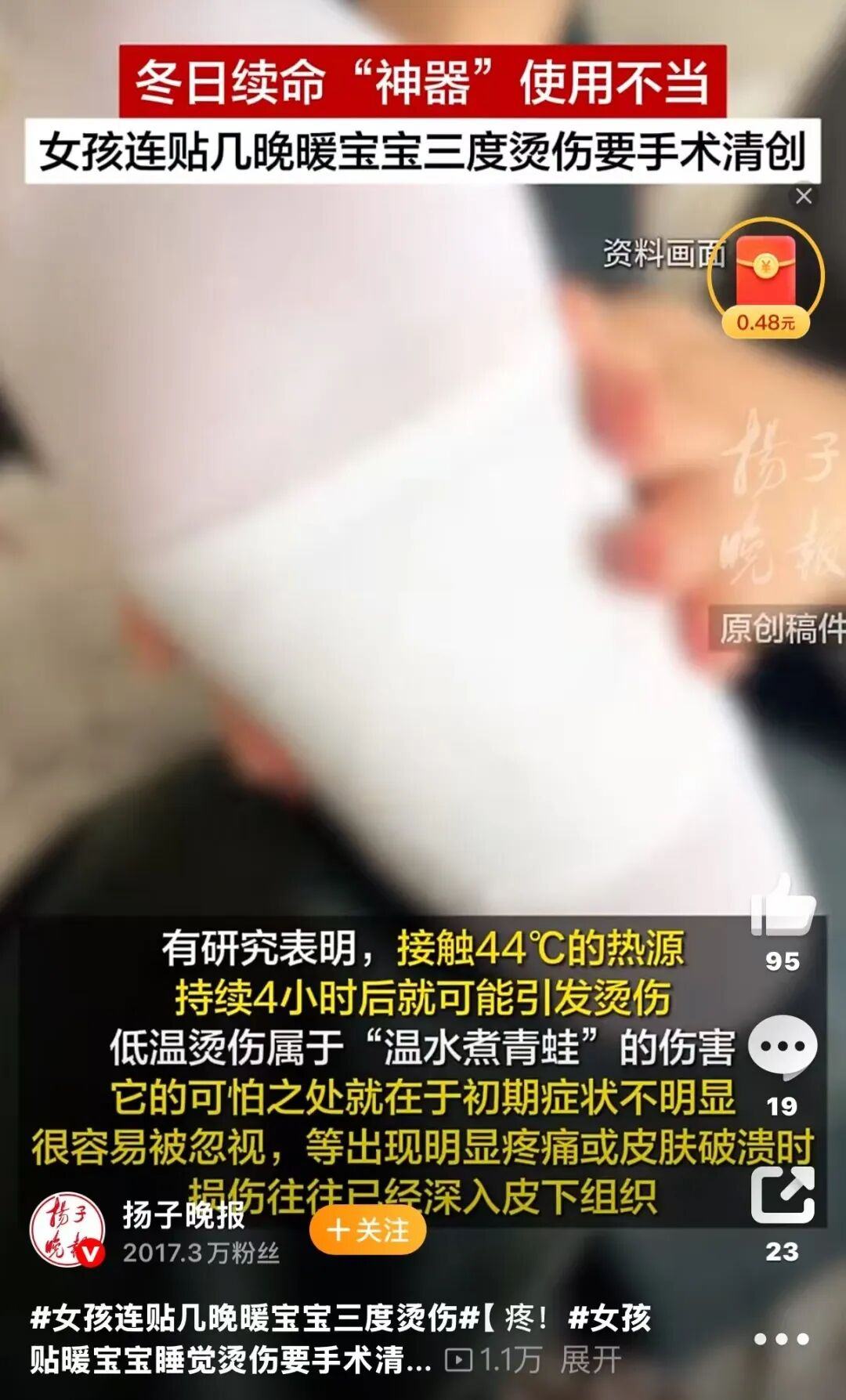 昨日,一则#女孩连贴几晚暖宝宝三度烫伤#的新闻引起关注。有网友在评论中吐槽说,“别说,这两天刚被暖宝宝烫破皮,真的痛,毫无知觉。”也有网友表示,暖宝宝的包装上一般都会注明“睡觉时请勿使用”。