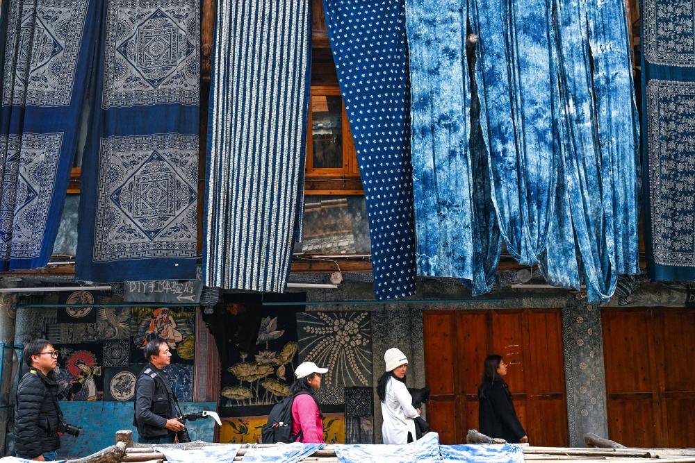 年关将至,侗寨游人如织。不少游客到侗品源靛染文化体验馆,了解传统非遗,体验靛染工艺,选购民族文化商品。