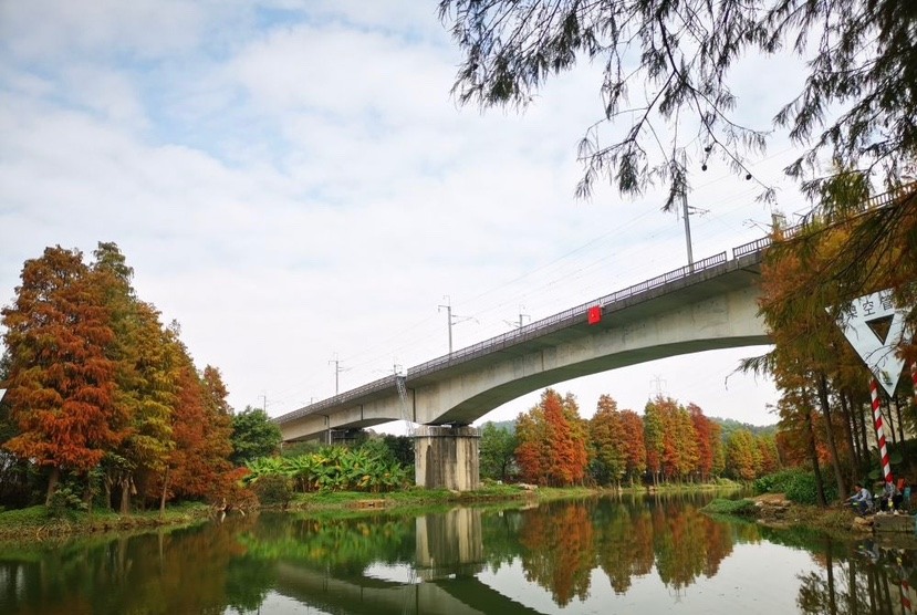 1月6日,记者在龙湾涌广深港高铁桥段看到,两岸落羽杉挺拔秀丽,叶子由绿变黄、由黄转红,层层叠染,在阳光照耀下更显绚烂。树影倒映于清澈的河水中,宛如一幅流动的油画。偶有白鹭掠水,高铁飞驰穿越,构成动静相宜的生态画卷。