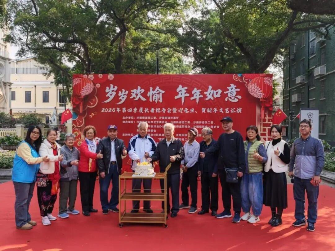 近日,沙面街“双百工程”社工服务站在沙面街道党工委、沙面街道办事处的指导下,联合沙面街道公共卫生委员会、沙面街道团工委、沙面街道关工委、沙面街道平安法治办公室、翠洲社区居委会等部门,共同举办“岁岁欢愉 年年如意”2025年第四季度长者祝寿会暨迎元旦、贺新年文艺汇演活动。现场百余位长者与工作人员、志愿者齐聚一堂,共庆生辰、喜迎新年。