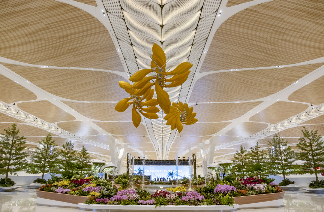 从“羊城花冠”的独特造型到国内首个机场向公众开放的全景观景平台,白云机场T3 航站楼不仅是出行枢纽,更成为承载岭南文化、吸引市民流连的“城市客厅”。航站楼内,“湾区广场”“花冠柱”值机岛、“东、西花园”“观景台”等核心空间,将大湾区的文化基因与自然意趣融入建筑肌理。当机场告别了“匆匆路过”的单一功能,化身为彰显大国风范的“国家门户”,广州白云机场T3航站楼展开了一场空间美学的深度革新,艺术为这座航空枢纽注入流动的生命力。