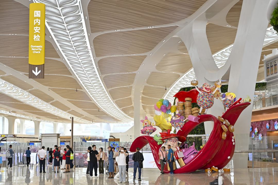 以木棉花苞为原型的42.6米瞭望塔、国内出发区“东山少爷”“西关小姐”造型的洗手间指引、遍布航站楼的大型艺术装置,共同构建起“羊城花冠”的文化符号。其中,九大核心艺术作品不仅成为旅客驻足观赏的打卡点,更成为展现广州城市形象的“空中文化展厅”,实现了空港服务与文化传播的有机融合。
