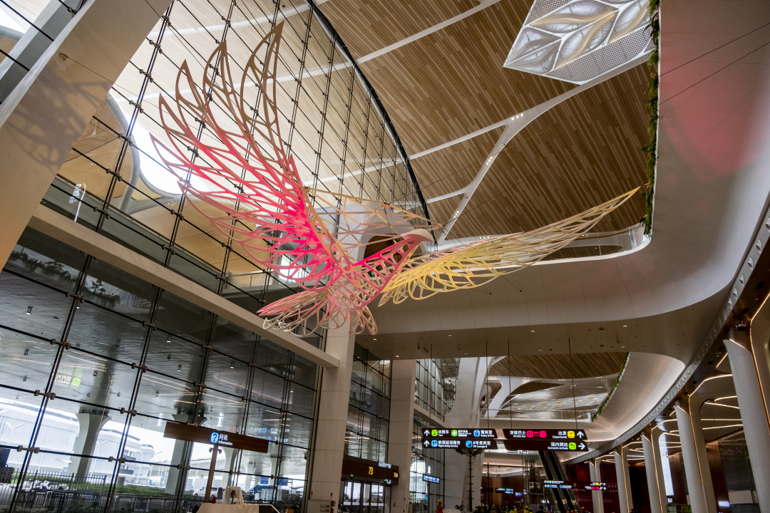 而今,艺术家把广东“省鸟”白鹇请到T3航站楼,与飞机航线之美梦幻联动,一只身姿如岭南山水般流畅写意,一只轮廓似机场钢结构般利落分明。
