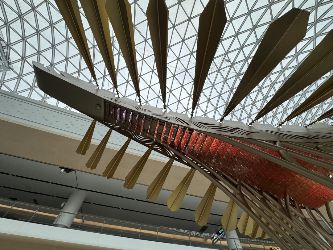 走近它,奇迹就发生。地面感应器会捕捉您的脚步,瞬间唤醒精密的机械系统——那一排排金属船桨开始整齐划动,重现龙舟破浪的英姿。当更多旅客加入互动,顶部的羽翼便会优雅展开,完成从“水上龙舟”到“空中飞舟”的华丽蜕变。这不仅是科技的展现,更是岭南精神的生动演绎。它用最有趣的方式告诉您:白云机场,既深植传统血脉,又永远向往蓝天。