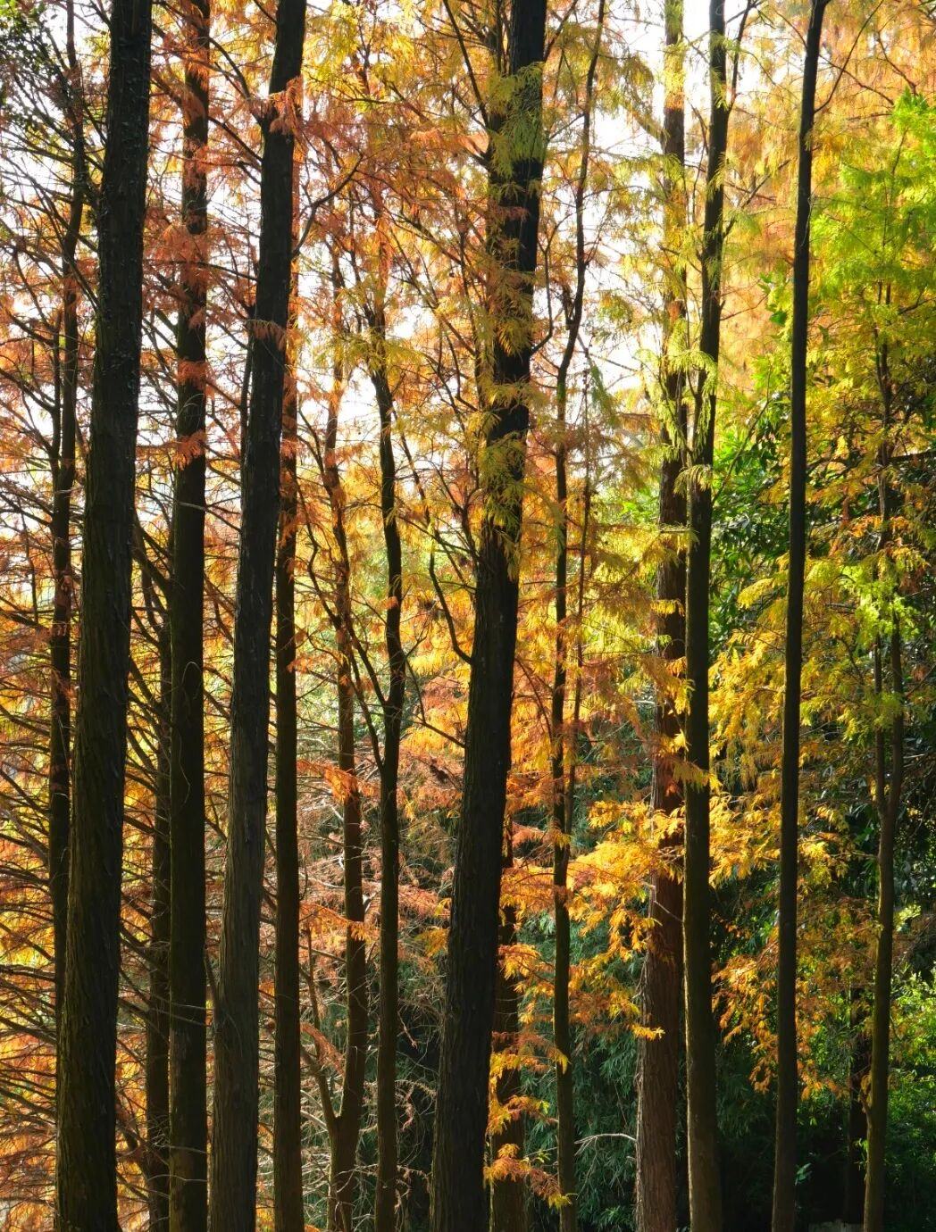 每年12月中下旬,大夫山落羽杉的树叶由黄绿转变为橙红,十分壮观迷人,吸引大量游客在此摄影留念。