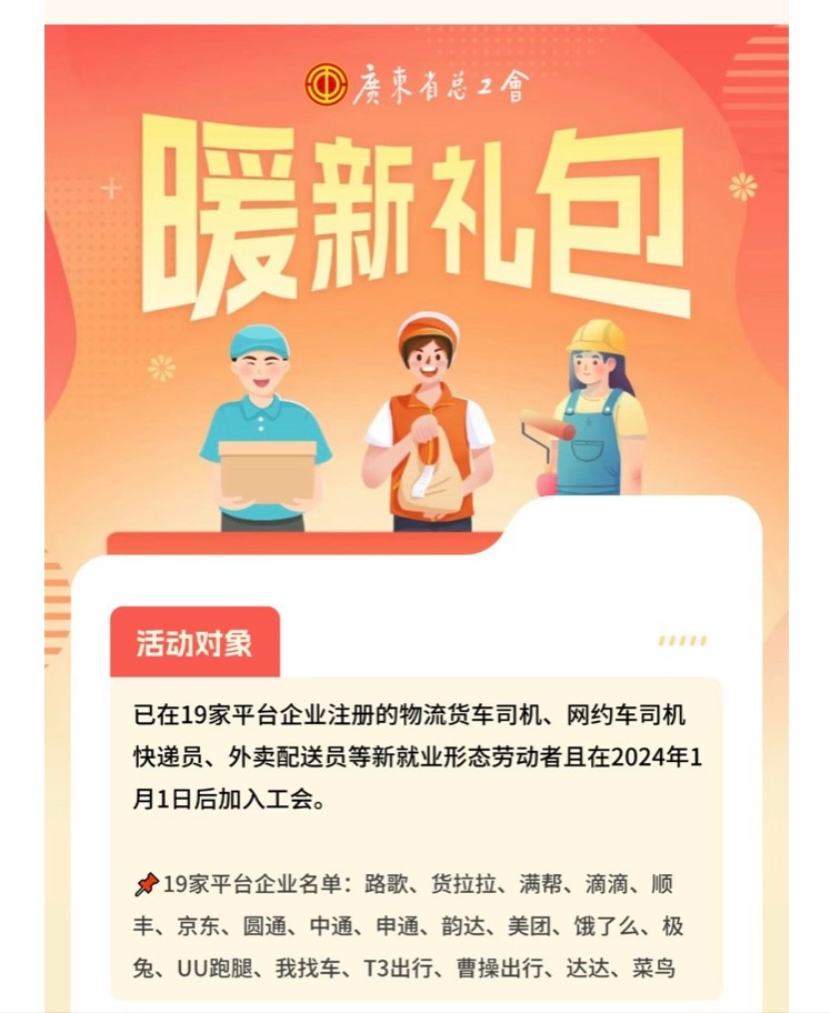记者今日从“广东省总工会”微信公众号了解到,近日,有超13万份50元话费充值权益礼包正在面向广东的货车司机、网约车司机、快递员、外卖配送员等新就业形态劳动者派送。本次活动对象为2024年1月1日后加入工会的19家平台企业注册的物流货车司机、网约车司机、快递员、外卖配送员等新就业形态劳动者。