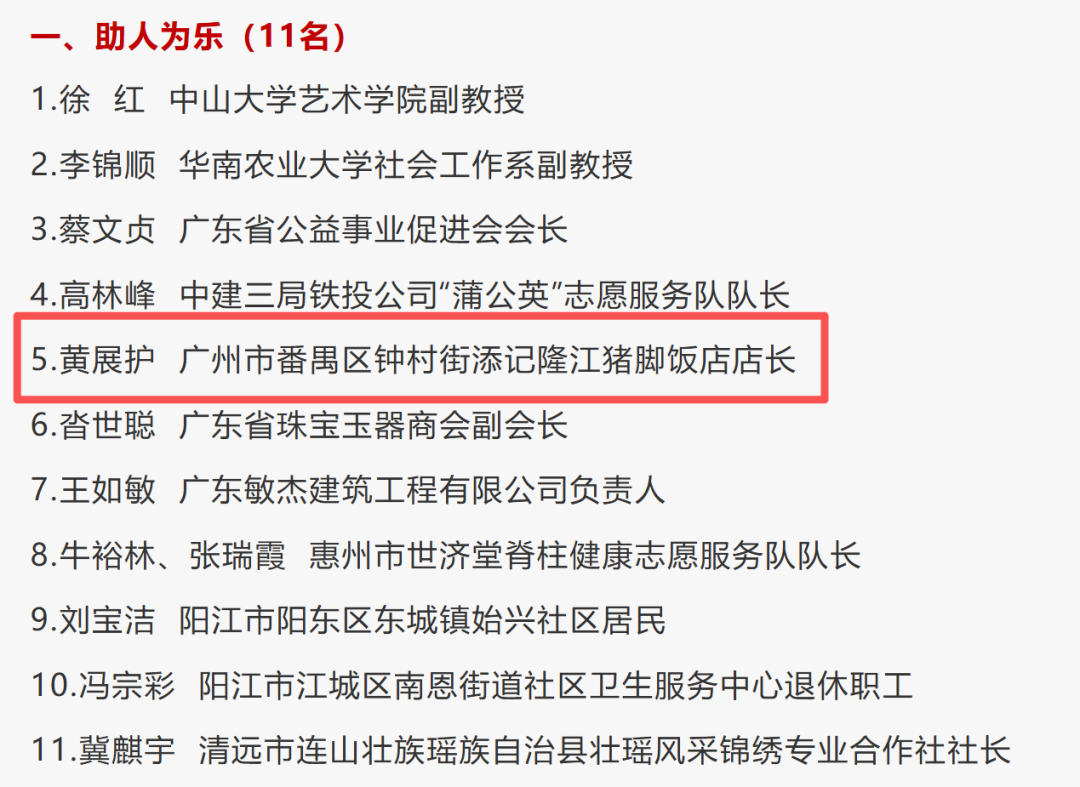 日前,广东省精神文明建设办公室公布2025年第二次“广东好人”名单,共50人上榜。其中,广州市番禺区钟村街添记隆江猪脚饭店店长黄展护榜上有名。