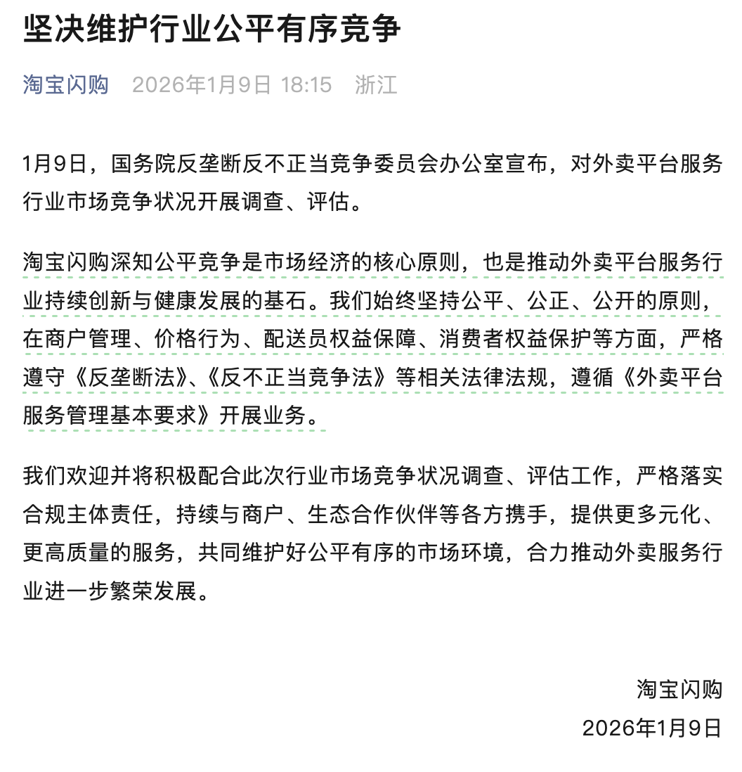 淘宝闪购还称,将积极配合此次行业市场竞争状况调查、评估工作,严格落实合规主体责任,持续与商户、生态合作伙伴等各方携手,提供更多元化、更高质量的服务,共同维护好公平有序的市场环境,合力推动外卖服务行业进一步繁荣发展。