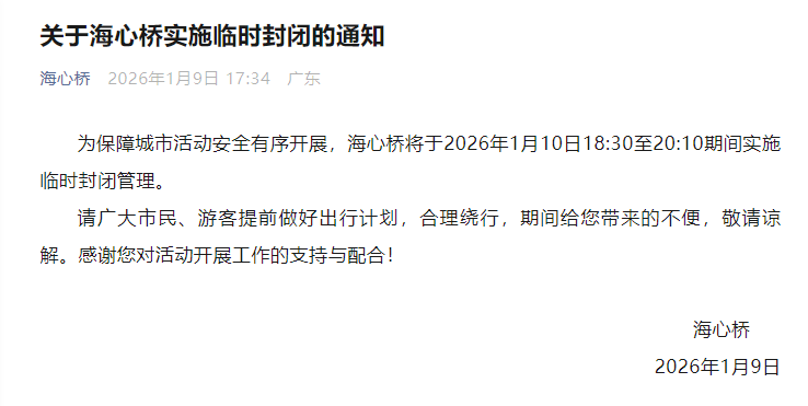 据海心桥公众号通知,为保障城市活动安全有序开展,海心桥将于2026年1月10日18:30至20:10期间实施临时封闭管理。请广大市民、游客提前做好出行计划,合理绕行。