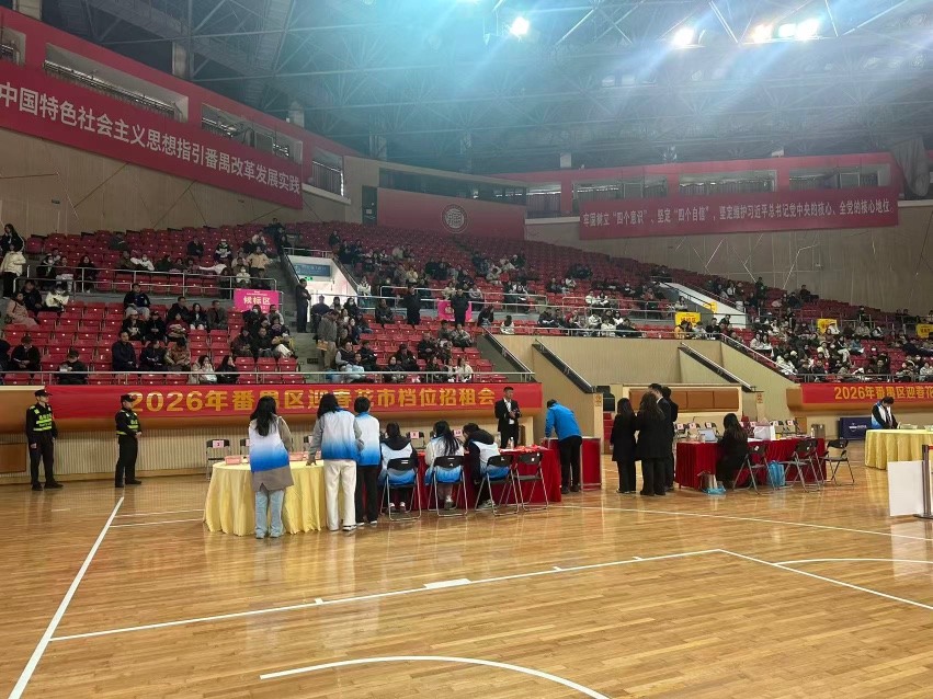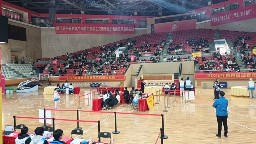 1月9日上午,2026年番禺区迎春花市主会场档位投标现场会在英东体育馆(篮球馆)举行,共400多名市民群众参加了此次竞投。
