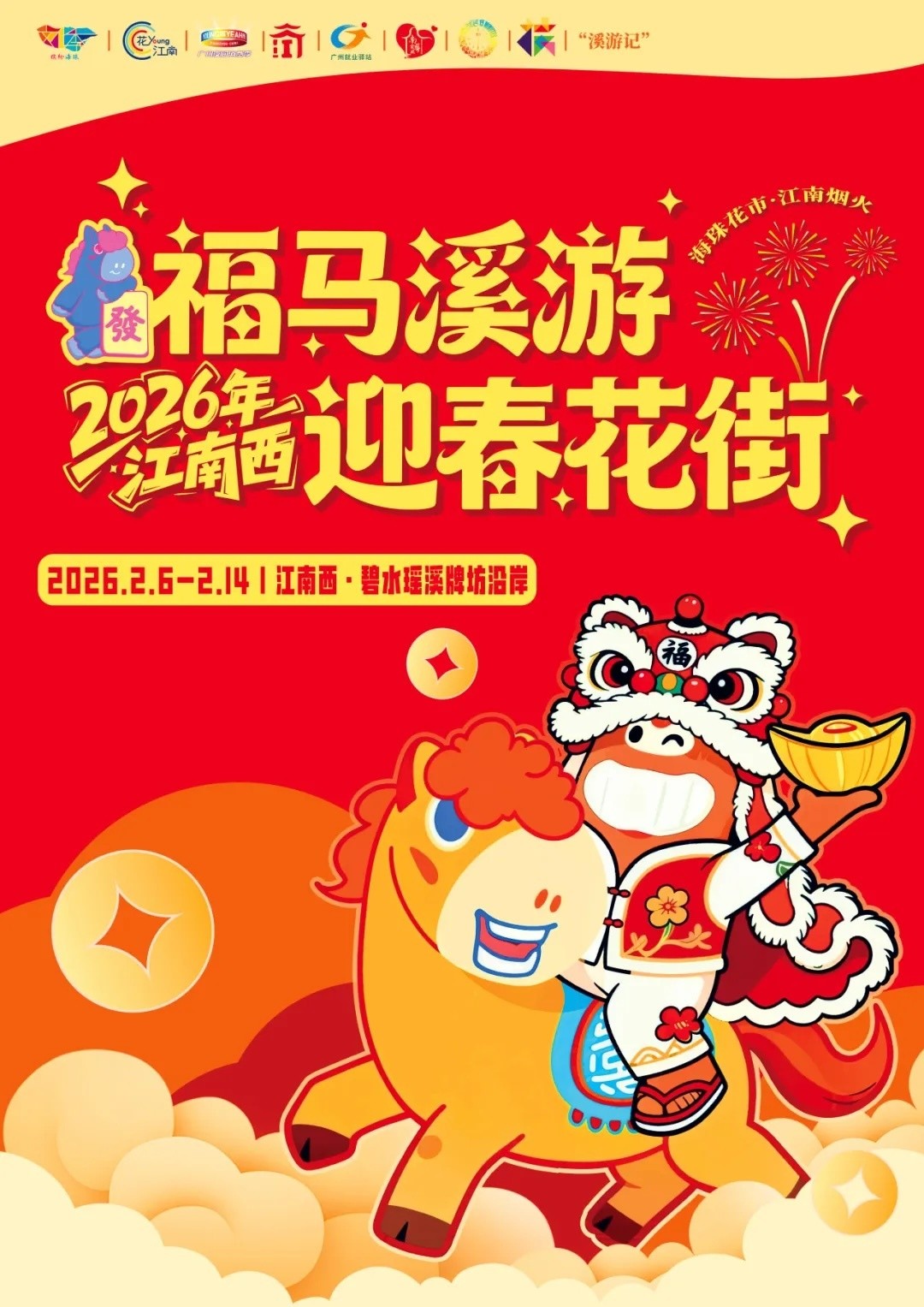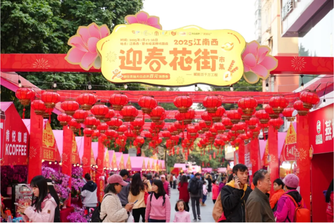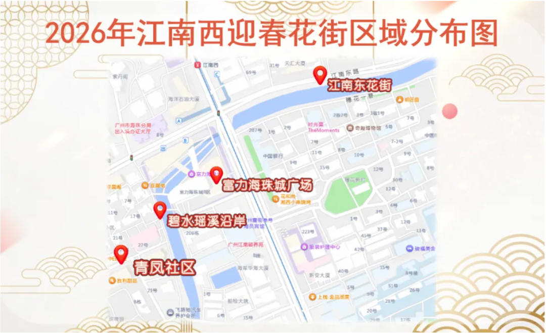 2026年江南西迎春花街整合江南东花街、富力海珠城、瑶溪花市(青凤社区)三大区域,精心绘制动态游览图。此外,花街还全面升级,潮流玩法+硬核福利双在线,不管是街坊、商家还是才艺达人,都能解锁专属新春乐趣。