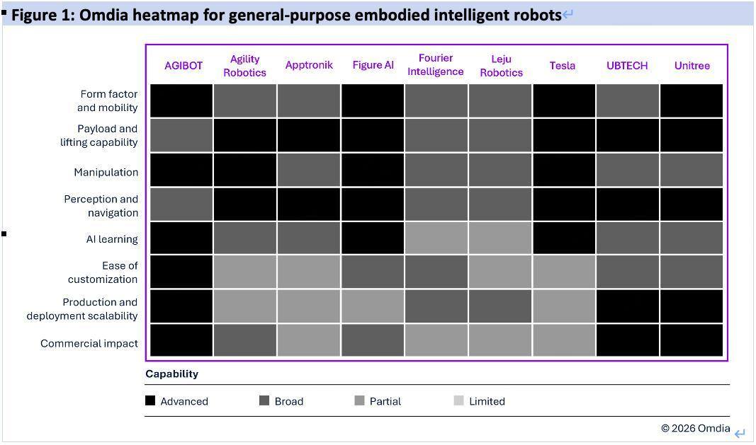 Omdia采用热力图模型对全球主流厂商进行了综合评估,涵盖产品形态、负载性能、灵巧操作、感知导航、AI学习、定制便捷、规模量产、规模商用共八项维度。智元在上述六项评估维度中获得最高评级(Advanced Capability),是本次评估中获得最多最高评级的厂商。
