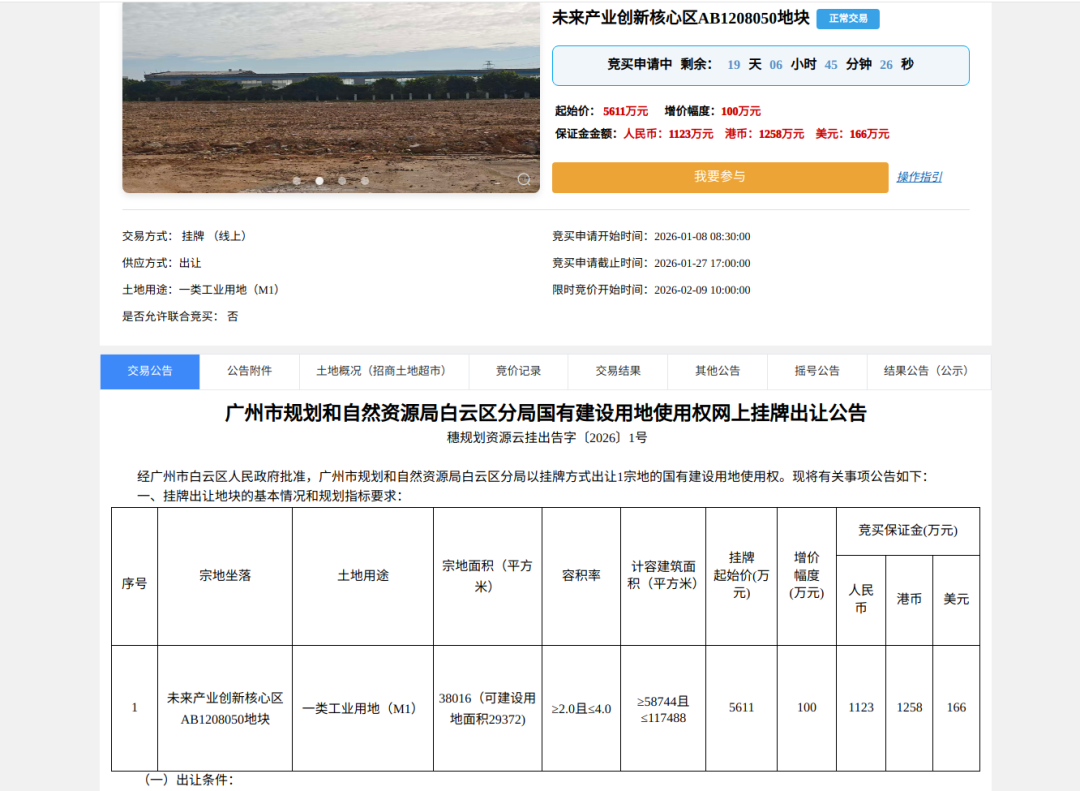 2026年1月8日,广州市白云区挂牌出让1宗一类工业用地,拟建设以人工智能(含高端装备、电子信息、新材料等)产业为主导产业的智造基地。