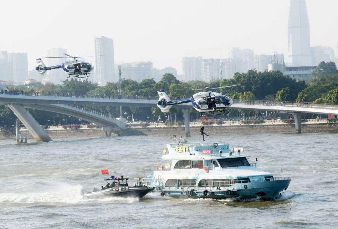 现场,水陆空全域协同警务实战演练、江面反走私拦截、落水人员救援、无人机投放救生设备等实战科目演示,全面展示广州公安“水陆空”全域立体化巡逻防控体系的建设成果。众多“硬核”场面引发市民阵阵喝彩。
