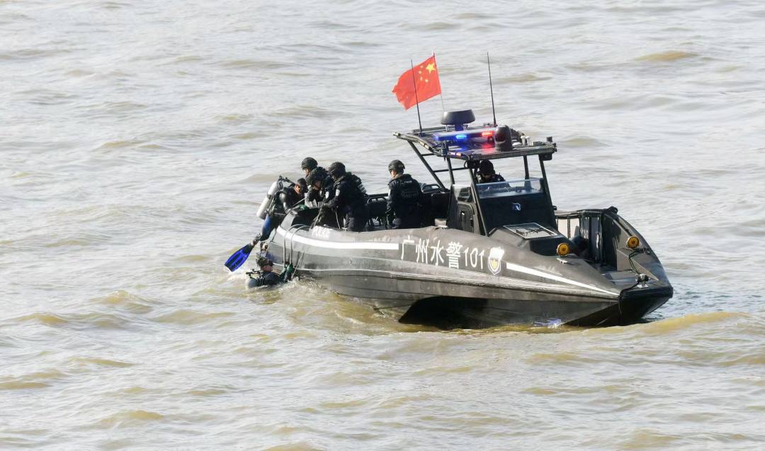 “看,直升机来了!”1月10日下午4时左右,在广州塔对出水上区域,警用直升机悬停空中,特警队员索降而下,身手敏捷完成垂直突入动作;高速巡逻艇进行战术穿插,逼停“嫌疑船”;蛙人入水打捞可疑物品、系留无人机升空转移危险物品……精彩的水陆空实战演练赢得现场市民群众“哇”声一片。