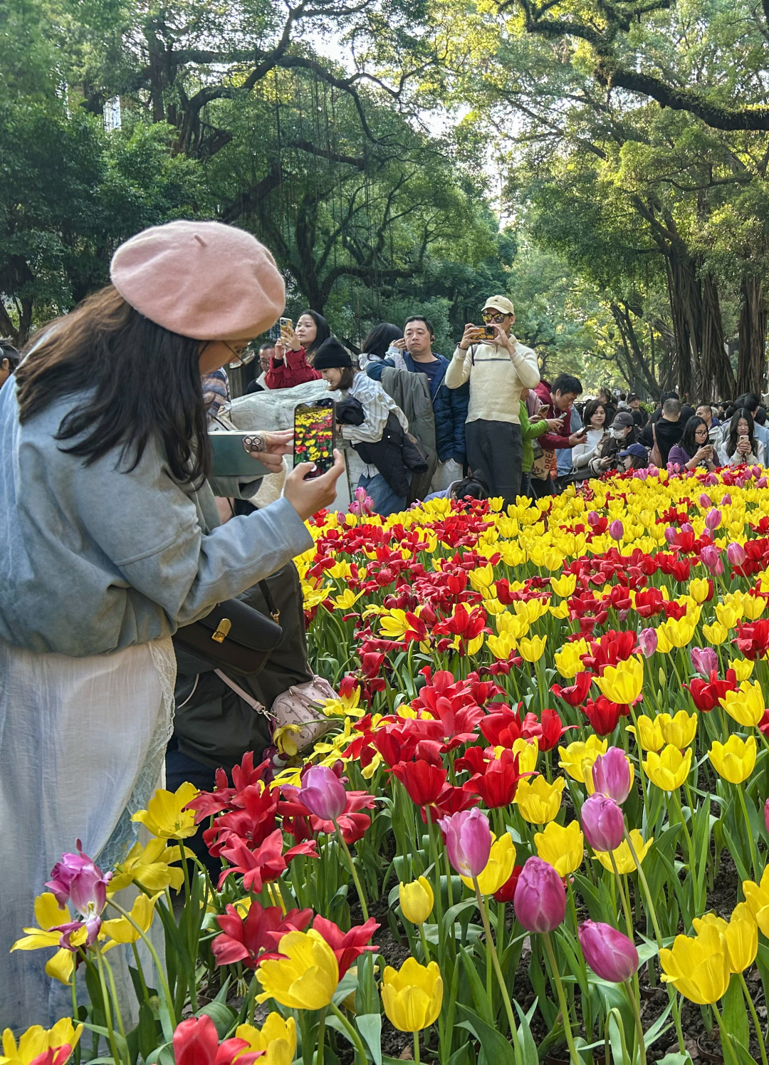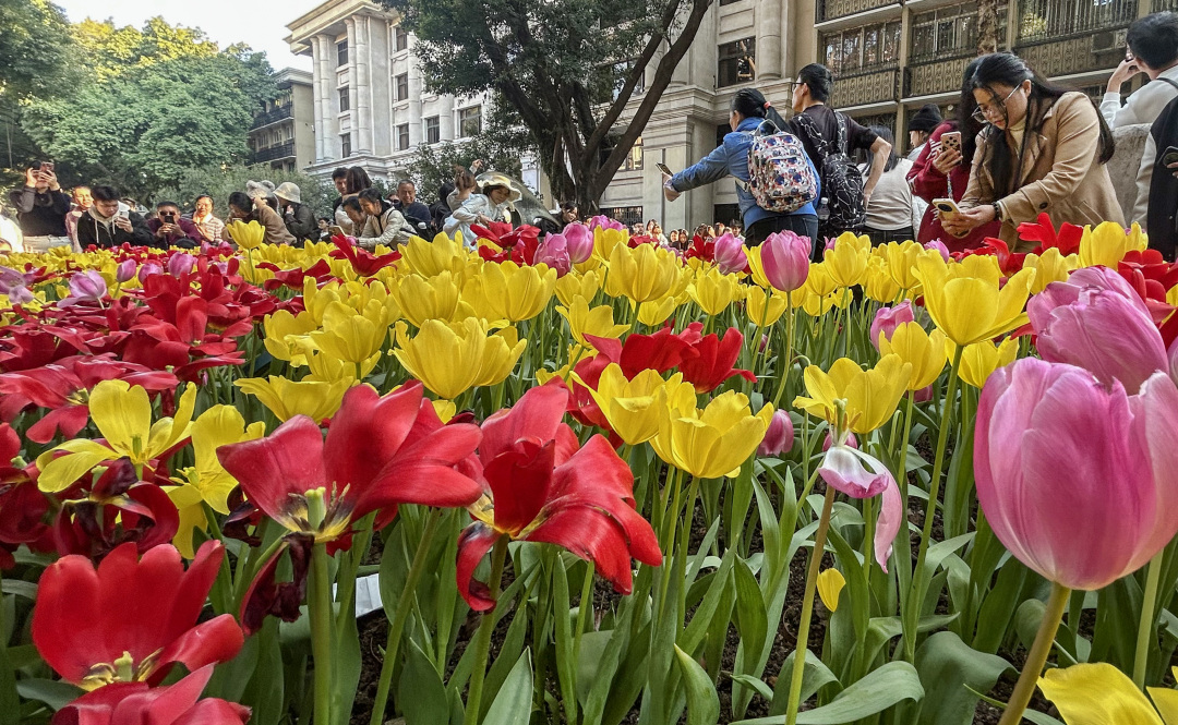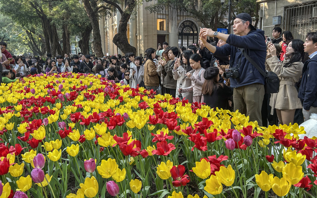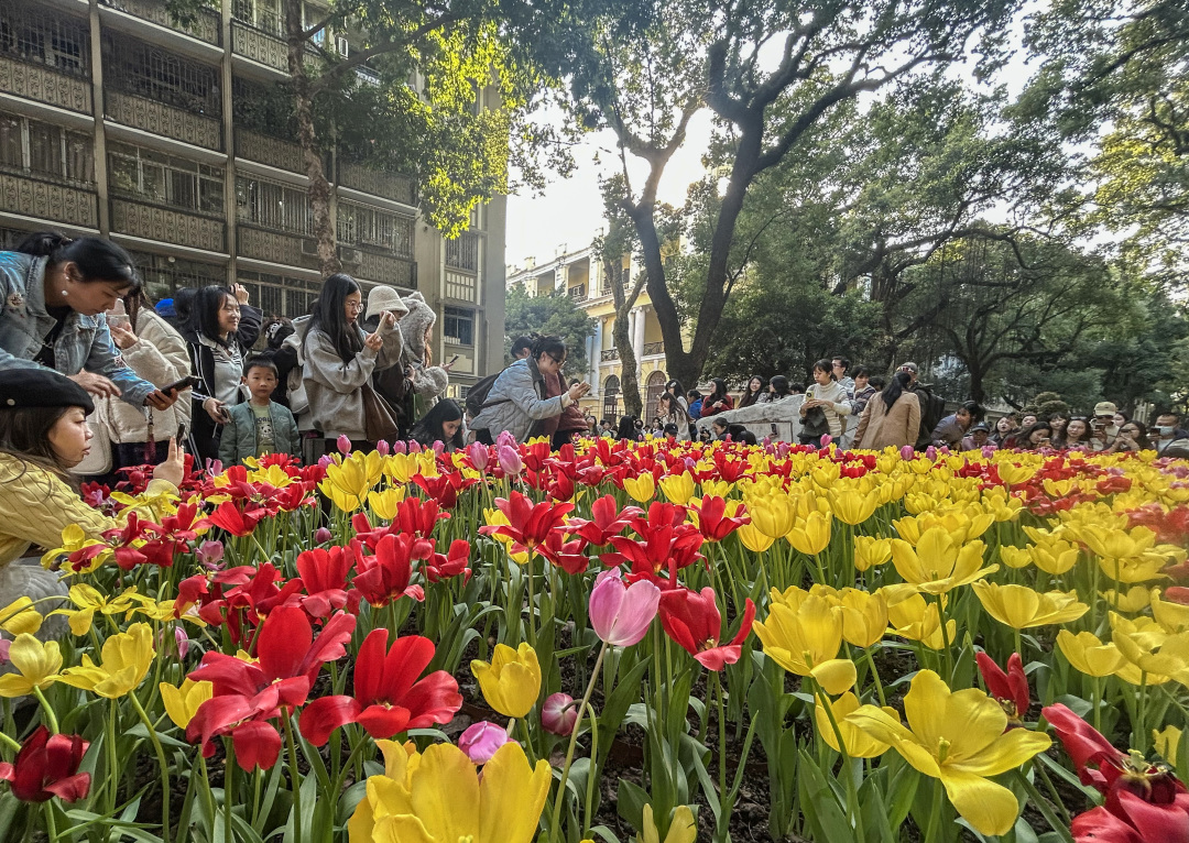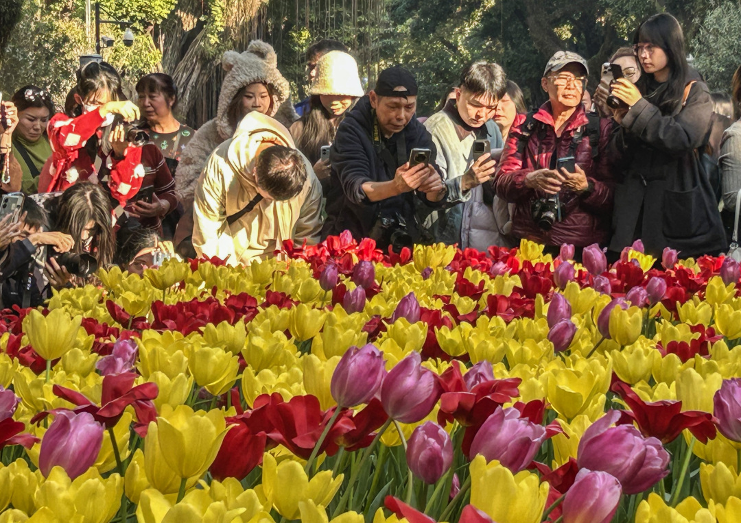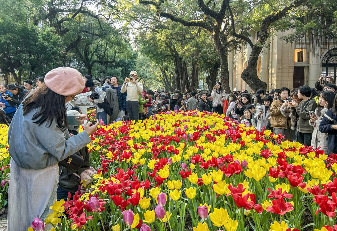 这个周末,广州的沙面岛迎来大批市民和游客,赏花拍花的人潮和绚烂的郁金香“花海”交织相融,绘就出一幅广州冬日里鲜活热闹的图景。