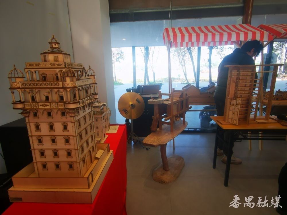 展览展现了开平碉楼的防御智慧、潮汕“四点金”的格局之美、广府骑楼的市井烟火、乡村别墅的现代融合,还展出了精雕细琢的传统木作工艺品。每⼀件模型都精准还原其应有的地域性特征和工艺美学,充分展示传统工匠“不⽤⼀钉⼀铆”的中式建造智慧。