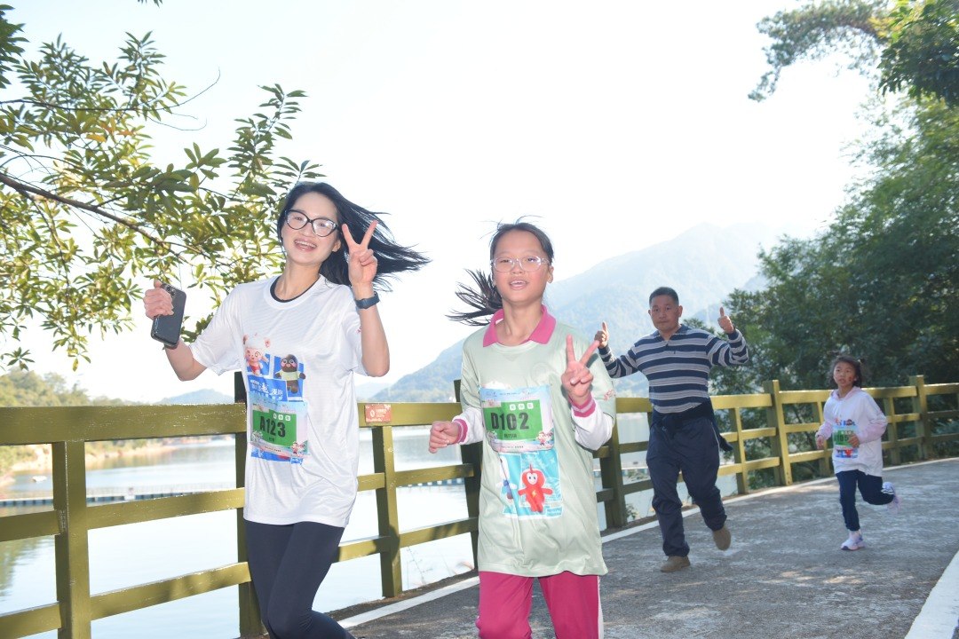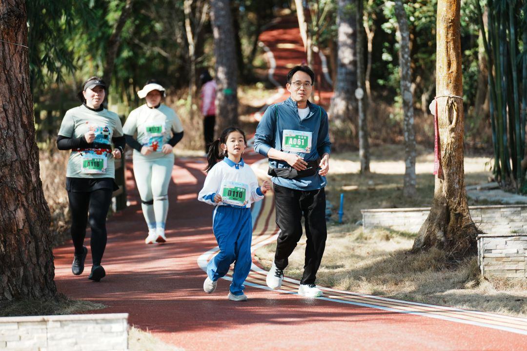 亲子陪伴组的4.5公里路线则更显温情与趣味。它缩短了距离,降低了难度,却丰富了互动体验。路线设计充分考虑儿童体能与兴趣点,将标志性景点以更适合亲子共赏的节奏串联。当天下午,亲子陪伴组在十五运会吉祥物喜洋洋和乐融融的加油助威声中出发。在被多彩森林环绕的赛道上,孩子们在漫跑大使的引领和家长的陪伴下,时而为奇特的树叶驻足,时而与掠过枝头的小鸟打招呼,漫跑成为了连接家庭与自然的纽带,在孩子心中播下热爱生态的种子。
