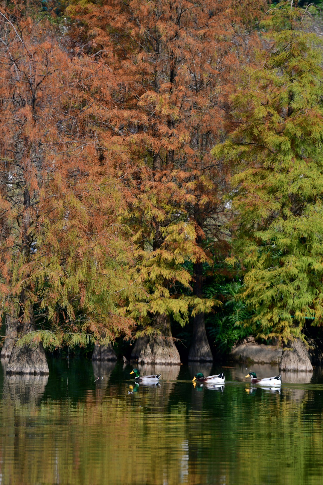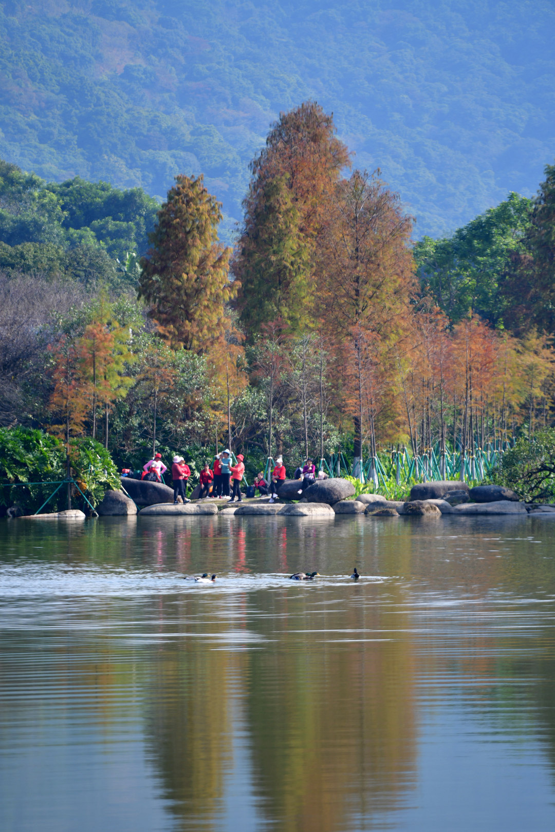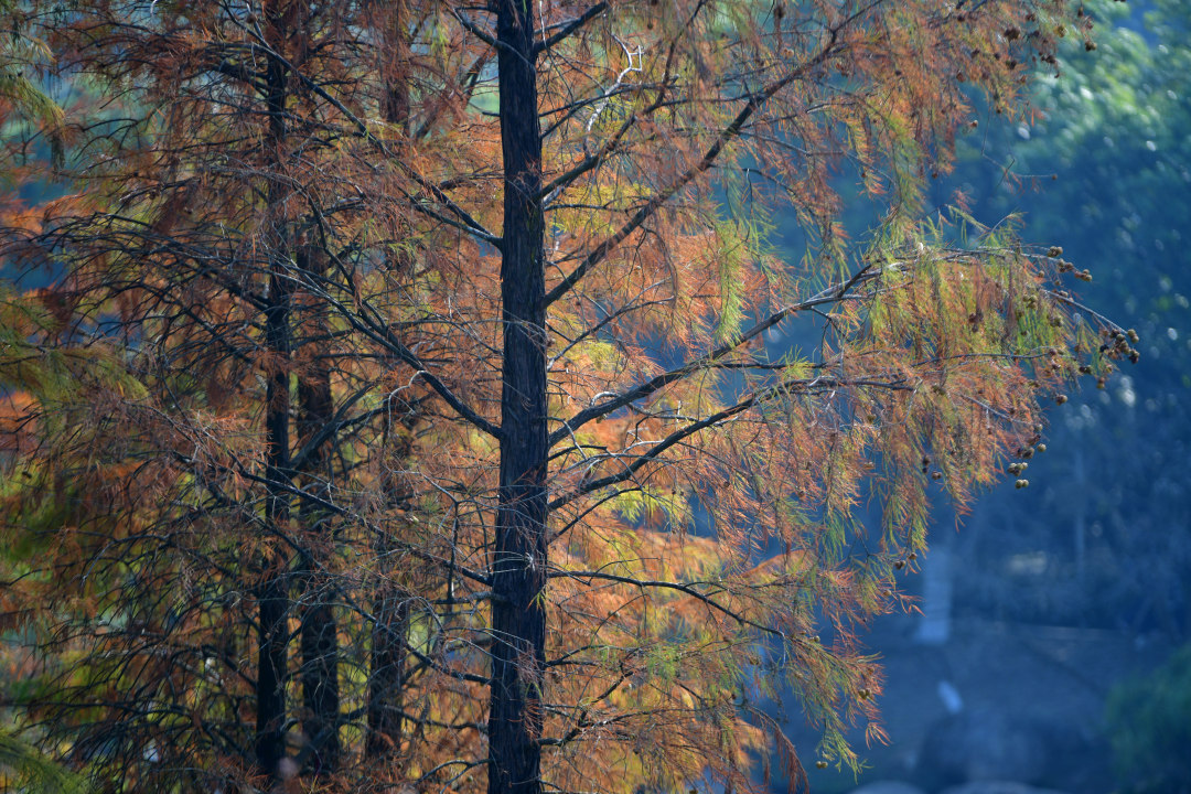 广州近日晴朗持续,气温缓慢回升。萝岗香雪公园里面的落羽杉在暖阳的天气之下悄然变红,红褐色的枝叶与蓝天相映衬,吸引了不少市民游客观赏。