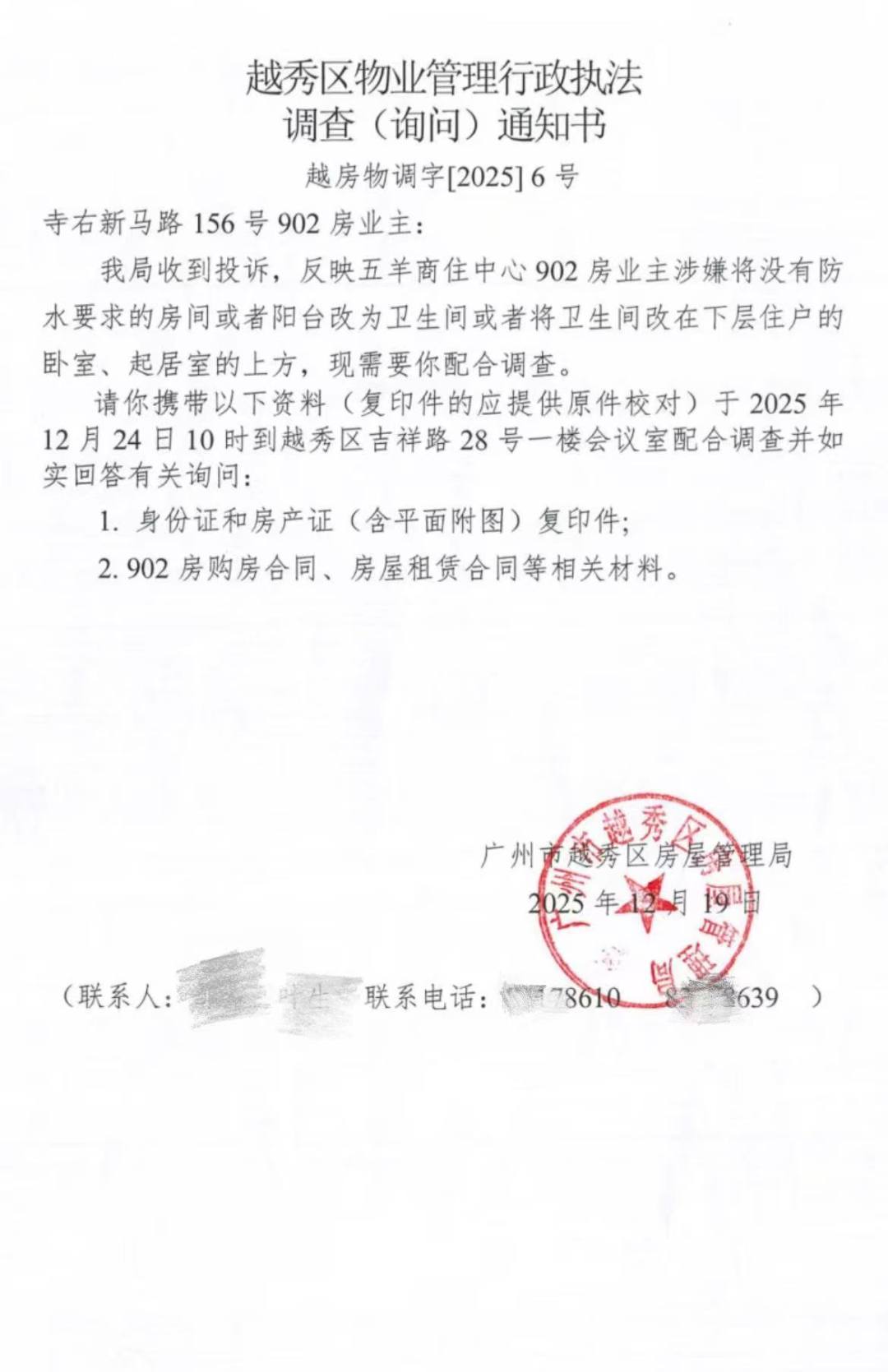 2025年12月19日,越秀区房屋管理局对902号房主下达了《越秀区物业管理行政调查(询问)通知书》。