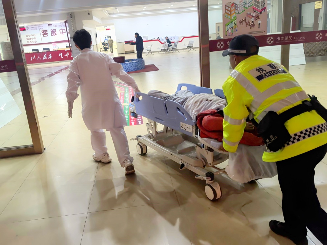 抵达南方医院太和分院后,两位铁骑队员随即与医护人员无缝接力、密切配合,小心翼翼地将老人平稳转移至担架,随后协助医护人员快速推送担架进入诊疗区域,成功为老人抢下了至关重要的救治黄金时间。