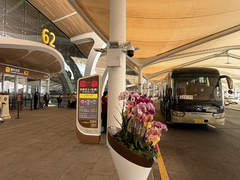 如果去错航站楼,旅客也可以找航站楼穿梭巴士站,只要出示机票就能免费去T2或者T3,24小时服务,高峰期行车间隔大约10分钟。