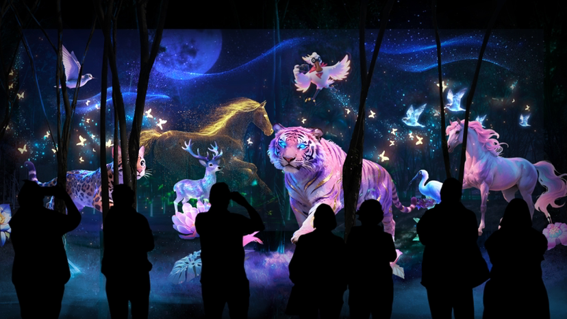二是绿野仙踪,生态和鸣。在生态秘境里,现实与幻想相互交织,人与自然和谐共生。光影艺术让红树林根系生辉、中华白海豚欢跃,绘就绿美湾区发展的伟大成就。