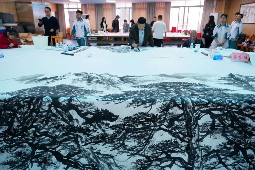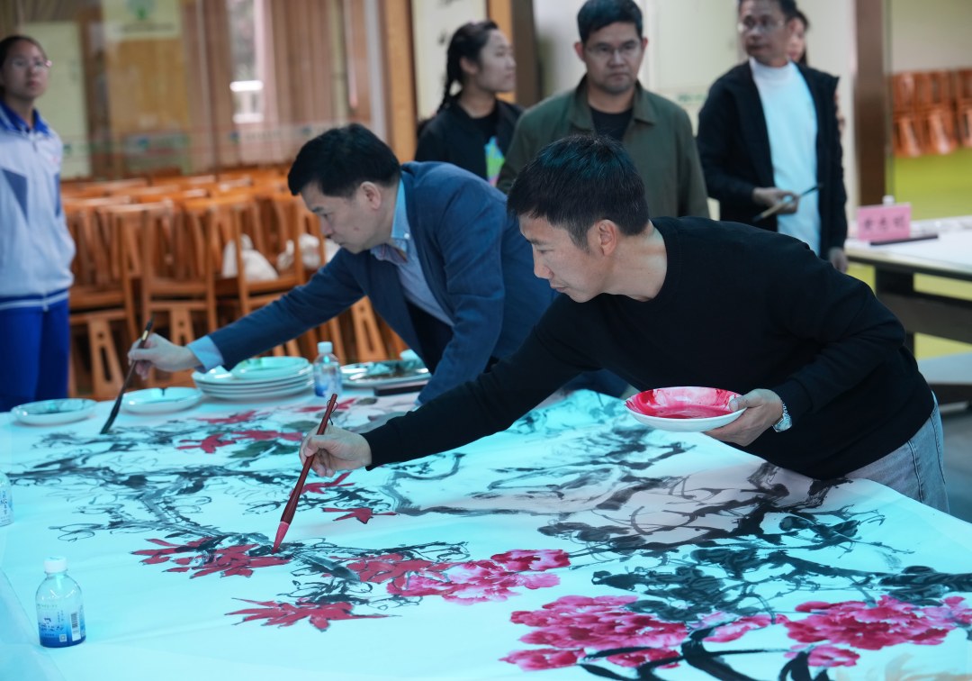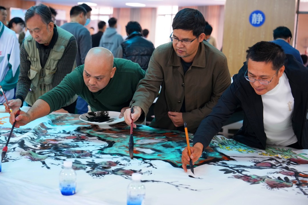 多位名家携手协作,以饱满笔墨传递同心之志与美好期许。刘斯奋、王永、曾嵘三位名家联袂合作山水画《山川万里壮志凌云》,以开阔的构图、苍劲的笔墨描绘出山河壮阔之景,既彰显了中华大地的雄奇气魄,又寄寓着对六中学子胸怀家国、奋勇争先的殷切期许;另有刘斯奋、何俊华、刘思东、孙戈、卢万华、彭国祥、冼一凡、黄志明、关胜祥、曾海亮、林锦添、郭超华、郭勇强等十三位艺术家同心协力,共同创作《春色满园》,画作中花鸟相映、草木葱茏,笔墨交融间尽显岭南画派的灵动气韵,寓意校园文化繁荣兴盛、学子成长朝气蓬勃,堪称本次活动的重磅佳作。