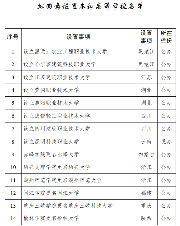 拟同意设置的14所本科高等学校名单中,8所为职业本科,6所为学院更名大学。