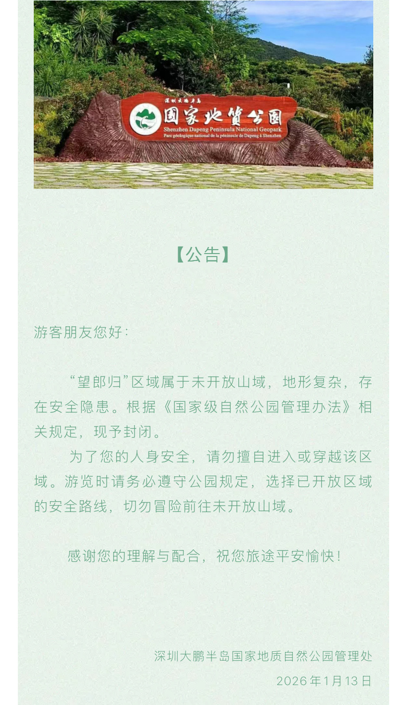 1月13日晚,深圳大鹏半岛国家地质自然公园管理处在公众号发布“公告”称,“望郎归”区域属于未开放山域,地形复杂,存在安全隐患。根据《国家级自然公园管理办法》相关规定,现予封闭。“为了您的人身安全,请勿擅自进入或穿越该区域。游览时请务必遵守公园规定,选择已开放区域的安全路线,切勿冒险前往未开放山域。”